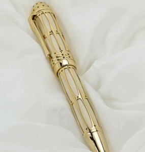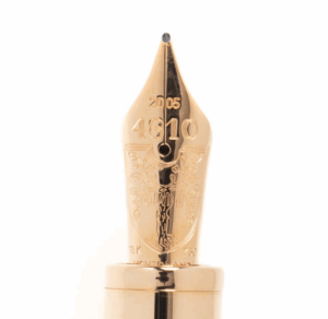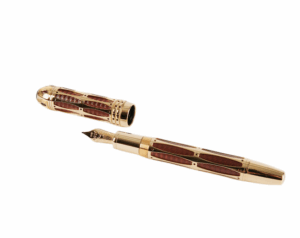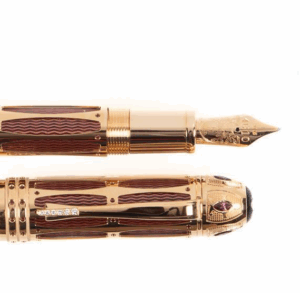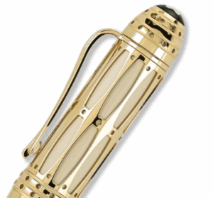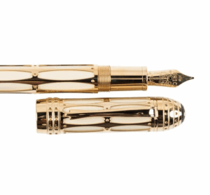 With its composition of gold-plated latticework on a cream-coloured lacquered background, the Patron of Art Edition Pope Julius II recalls the colours of the papal clothing. On the Edition 888 the filigree latticework is made of 750 solid gold and the guilloched lacquer background shimmers in a luxuriant maroon. The cap head is a masterful reflection of the tiara, the headdress of the Pontiff. The cap top is set with a rhodolite in navette cut, while the Au 750 solid gold clip is set with 6 diamonds. The 18-carat gold nib bears the finely engraved emblem of the Pope , the coat of arms of Pope Julius II, who, like hardly any other before or after him, led the clergy and was a Patron of the Arts. Six diamonds adorn the Au 750 solid gold clip, while the Au 750 solid gold nib is decorated with the seal of Pope Julius II. One Limited Edition 3 is enriched with 528 white diamonds (~2.3 ct) and 328 black diamonds (~1.4 ct), while the other writing jewel is adorned with 861 white diamonds (~3.8 ct).