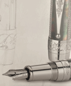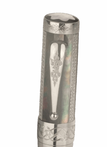 The black mother-of-pearl on the cap and barrel of the Limited Edition 8 is a reminiscence of the sumptuous jewellery of the Renaissance, The creation is enriched with Au 750 white gold fittings and inlays set with 342 diamonds in brilliant cut (~1,4 ct). The ornamental work on the rings and clip are inspired by Renaissance patterns as François I was called the “Renaissance King”, and the Au 750 solid gold, rhodium-coated nib is decorated with a fleur-de-lis, the symbol of the French royal house. The Montblanc emblem is made of mother-of-pearl.