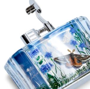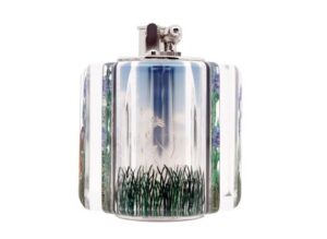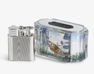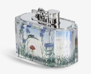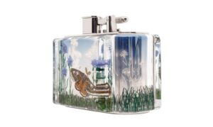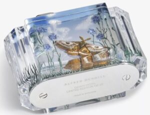 Destined to draw admiring comments for generations to come, the ‘Blue Aquarium Moth’ table lighter is embellished with hand-carved and hand-painted designs inspired by archive pieces. A celebration of the tranquility and timeless beauty of the English countryside, one face of the lighter features an Emperor moth – a powerful symbol of change and rebirth – soaring amid vivid blue cornflowers and wavering grasses. On the reverse, a caterpillar scales a blade of grass above a vibrant red toadstool. Inside the case is a Dunhill Turbo lighter, the epitome of considered craftsmanship. Introduced over a century ago as a sports lighter that would work reliably in all weathers, it has since been re-engineered with a butane-powered, wind-resistant jet flame. Also available as a pocket lighter, only 22 editions of each ”Aquarium Moth” iteration will be made available worldwide.