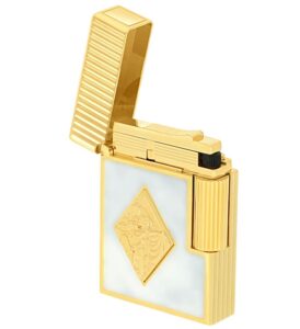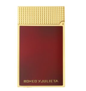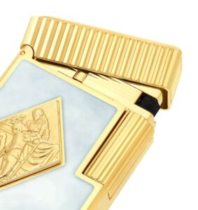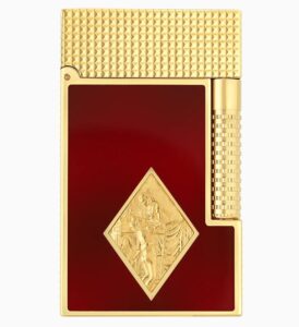 The Grand Dupont lighter celebrates the spirit of Romeo y Julieta with a bas-relief medallion inspired by the cigar maker’s emblem. Deep red lacquer, applied with the traditional popoté technique, pairs with golden finishes to create a uniquely timeworn patina.