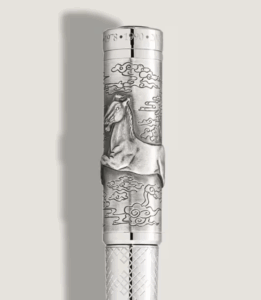 Encircling the horse are delicate engravings of the lucky cloud (祥云), a traditional Chinese motif symbolizing blessings and good luck. The platinum-coated barrel continues the theme of prosperity with an intricate pattern inspired by the Chinese knot (Zhōngguó jié, 中国结), representing unity and longevity.