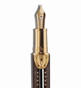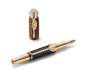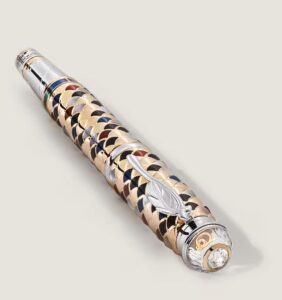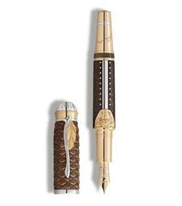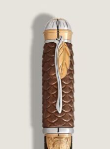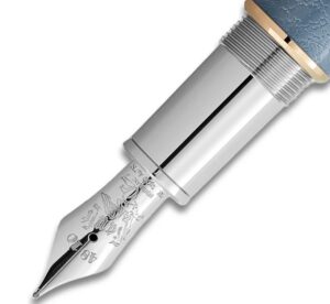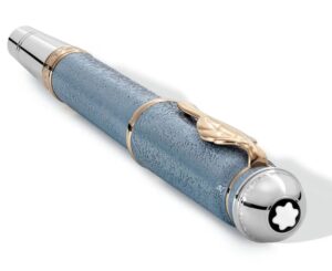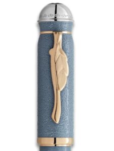 Faust also inspired the design: the nib features an engraved scene echoing Eugène Delacroix’s lithographs of Mephistopheles above the city, with the lettering ‘Faust’ and ‘1790’ marking the original publication date. Goethe’s thirst for knowledge and exploration of the natural world is reflected throughout the pen — from the slightly curved cap reminiscent of a chemist’s glass jar to the leaf-shaped clip honoring his studies in plant morphology.