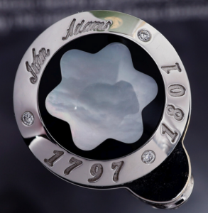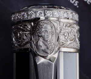 The cap carries an elegant ring set with 25 diamonds (each 1.5 mm) along with three additional diamonds (1.2 mm) totaling approximately 0.35 carats. Around the Montblanc emblem—crafted from luminous mother-of-pearl—you’ll find John Adams’ signature and his presidential term (1797–1801). The clip is richly engraved with a portrait of John Adams, while the clip rings portray olive leaves inspired by the artwork on the one-dollar bill.